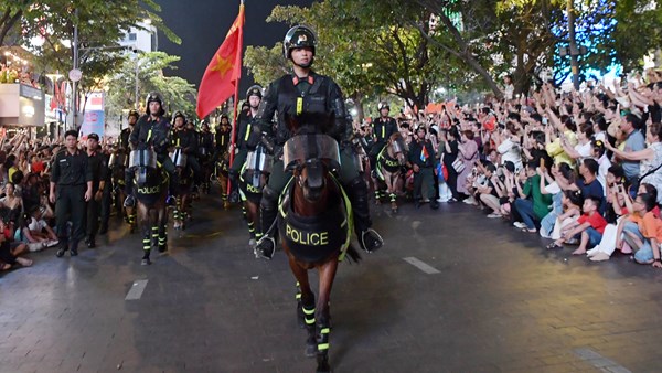 VOVVN - VOV.VN - Đội Cảnh sát cơ động kỵ binh có màn diễu hành và giao lưu với người dân tại phố đi bộ Nguyễn Huệ (TP.HCM) vào tối 30/4.