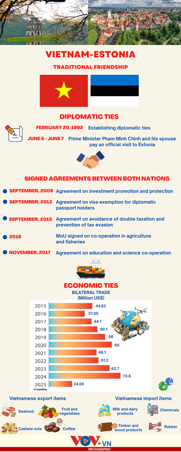 VOVVN - VOV.VN - Prime Minister Pham Minh Chinh, accompanied by his spouse and a high-ranking delegation, is on an official visit to Estonia from June 5 to 7. This marks the first-ever official trip by a...