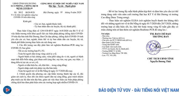 VOVVN - VOV.VN - Tỉnh Hải Dương sẽ tiến hành xét nghiệm Realtime-PCR cho toàn bộ người trở về Đà Nẵng từ ngày 21/7 đến nay.