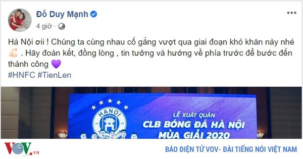 VOVVN - VOV.VN - Trung vệ Đỗ Duy Mạnh viết "tâm thư" động viên các đồng đội ở Hà Nội FC sau 2 thất bại liên tiếp trên sân nhà Hàng Đẫy.