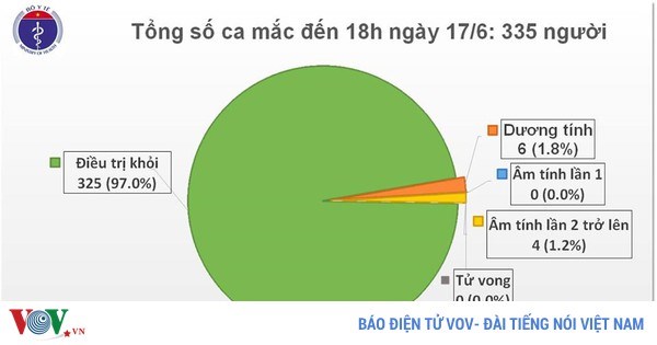 VOVVN - VOV.VN -Theo Bộ Y tế, đến 18h chiều 17/6, Việt Nam không có ca mắc Covid-19 mới. Tổng số ca mắc hiện nay là 335 ca, trong đó đã có 325 ca đã được điều...