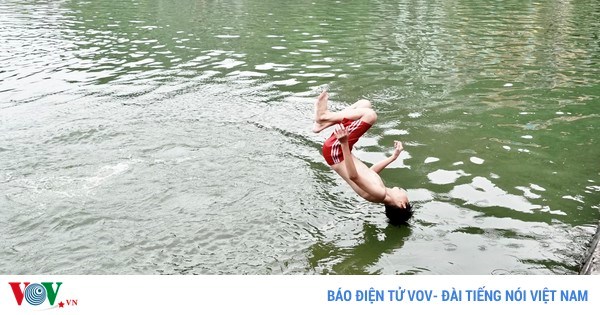 VOVVN - VOV.VN - Theo ghi nhận, tại hồ Long Trì, huyện Quốc Oai, Hà Nội có rất nhiều trẻ em nhảy lộn, lao đầu xuống hồ rất nguy hiểm, có thể ảnh hưởng tới tính mạng.