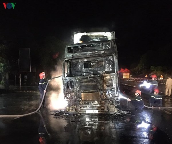 VOVVN - VOV.VN - Đang chạy trên quốc lộ 1A chiếc xe đầu kéo phát hỏa rồi bốc cháy dữ dội, thiêu rụi gần như toàn bộ phần đầu xe.