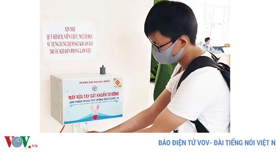 VOVVN - Vừa qua, thầy và trò Trường Đại học Quy Nhơn đã chế tạo 2 loại thiết bị cấp tốc gồm máy rửa tay sát khuẩn tự động và máy đo thân nhiệt tự động từ...