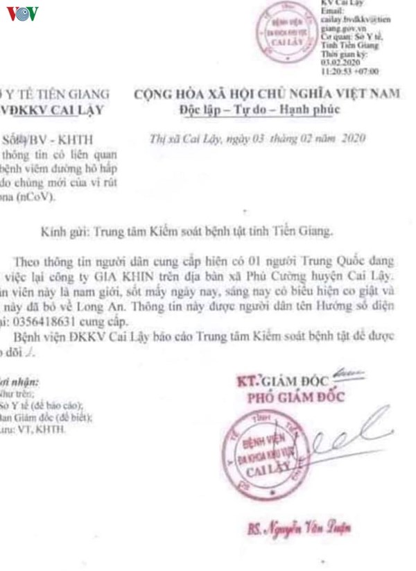 VOVVN - VOV.VN -Như vậy thông tin có một người Trung Quốc bị sốt, co giật tại Công ty JIA HSIN ở xã Phú Cường, huyện Cai Lậy (Tiền Giang) đã bỏ đi là không chính xác.