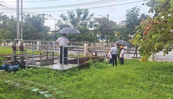 VOVVN - VOV.VN - Lực lượng chức năng lấy mẫu nước thải sau xử lý để làm rõ nguyên nhân suối Bà Lúa nổi bọt trắng xoá.