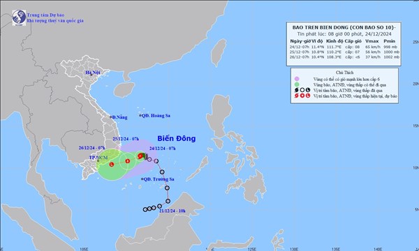 VOVVN - VOV.VN - Vị trí tâm bão số 10 ở vào khoảng 11,4 độ Vĩ Bắc; 111,7 độ Kinh Đông, trên vùng biển phía Tây Nam khu vực Giữa Biển Đông.