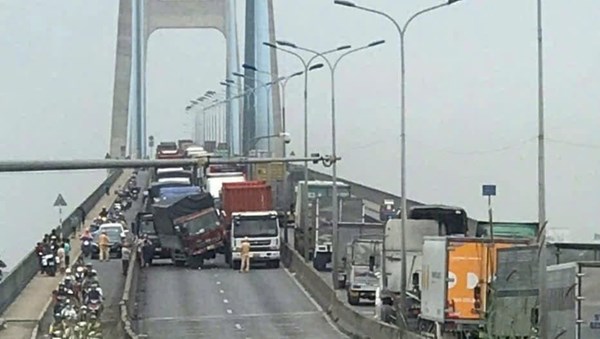 VOVVN - VOV.VN - Chiều 13/12, hai xe tải và container bất ngờ va chạm khi đang đổ dốc cầu, sau đó, xe tải đâm nghiêng vào xe đầu kéo gây ra ùn tắc kéo dài trên...