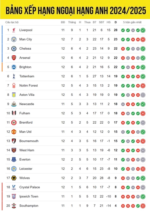 VOVVN - VOV.VN - Bảng xếp hạng Ngoại hạng Anh 2024/2025 mới nhất: Man City lâm nguy, MU chưa đá đã tăng bậc do đội xếp sau để thua ở vòng 12.