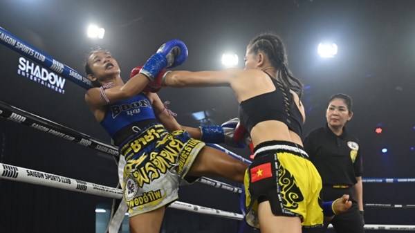 VOVVN - VOV.VN - Nữ võ sĩ Huỳnh Hà Hữu Hiếu giành chiến thắng knock-out trước võ sĩ Thái Lan sau loạt đòn trúng mặt đối thủ.