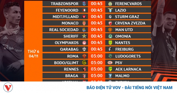 VOVVN - VOV.VN - Cập nhật lịch thi đấu vòng 6 Europa League 2022/2023, MU quyết đấu để tranh ngôi nhất bảng với Real Sociedad.
