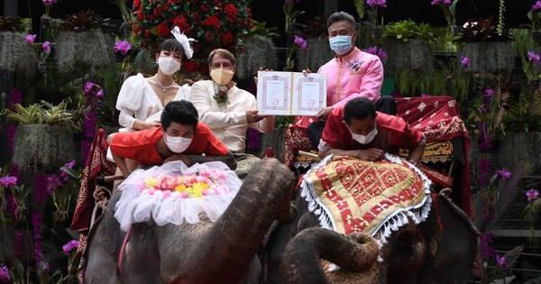 VOV1 - Hơn 40 cặp đôi Thái Lan hôm nay đã tổ chức đám cưới đặc biệt trên lưng voi tại Vườn nhiệt đới Nong Nốch (Nong Nooch) ở tỉnh Chơn-bu-ri (Chonburi) nước này, nhân dịp kỷ...