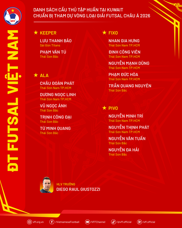Danh sách đội tuyển futsal Việt Nam dự vòng loại châu Á 2026