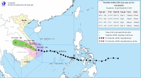 VOVVN - VOV.VN - Theo Trung tâm Dự báo Khí tượng Thủy văn Quốc gia, hồi 19h ngày 6/11, tâm bão số 13 nằm trên đất liền ven biển Gia Lai–Đắk Lắk, sức gió mạnh nhất cấp...