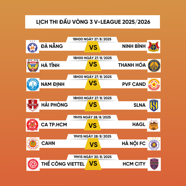 VOVVN - VOV.VN - Lịch thi đấu vòng 3 V-League 2025/2026, CAHN đại chiến Hà Nội FC trên sân Hàng Đẫy, trong khi Nam Định tiếp đón PVF CAND trên sân nhà.