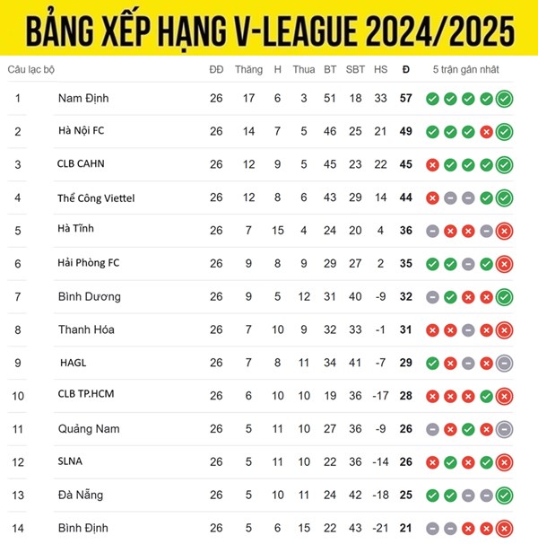 VOVVN - VOV.VN - Bảng xếp hạng V-League 2024/2025 chung cuộc, Nam Định vô địch, 2 đội bóng Thủ đô là Hà Nội FC cùng CLB CAHN có mặt trong tốp ba. Trong khi đó, Bình Định...