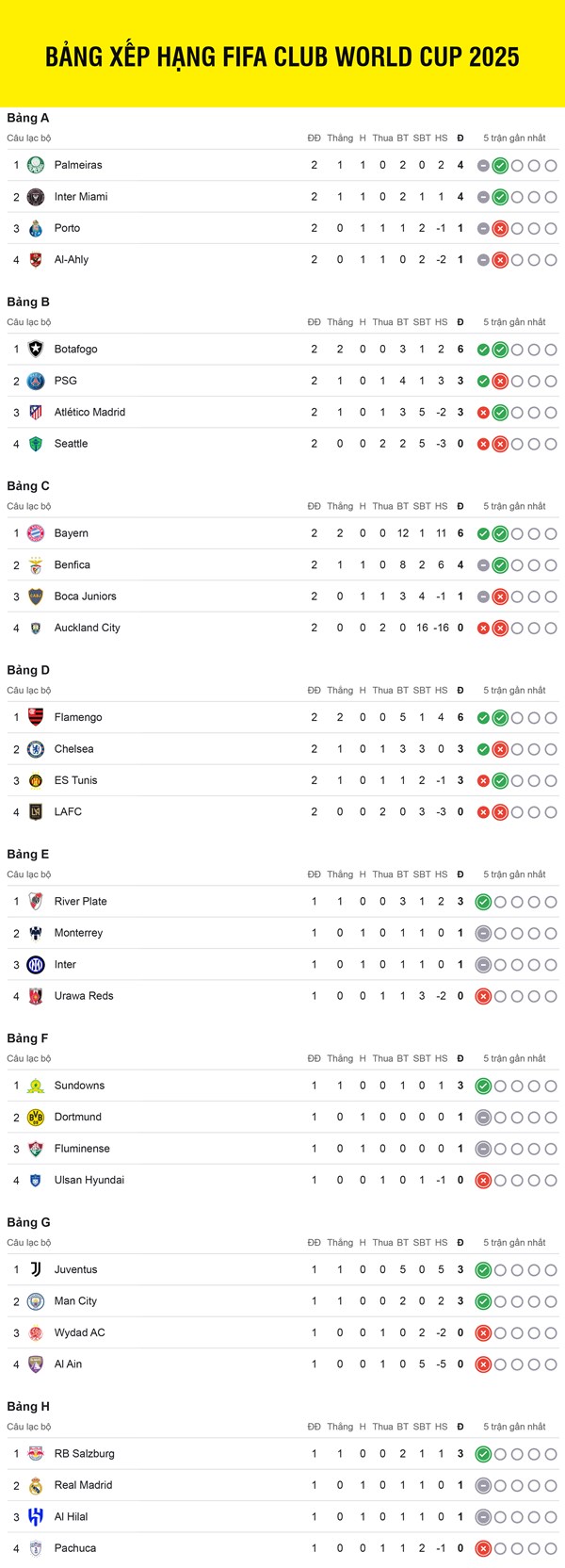 Bảng xếp hạng FIFA Club World Cup 2025 mới nhất: Xác định 2 đội vào...