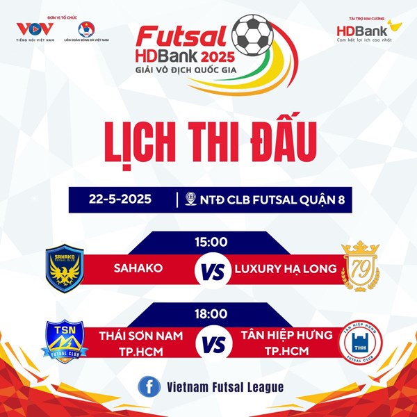 VOVVN - VOV.VN - Báo Điện tử Tiếng nói Việt Nam xin gửi tới quý độc giả lịch thi đấu và trực tiếp Giải Futsal HDBank VĐQG 2025 ngày 22/5.