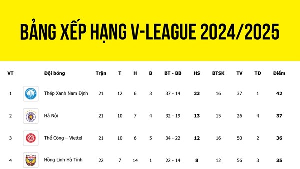 VOVVN - VOV.VN - Bảng xếp hạng V-League 2024/2025 mới nhất: CLB Hà Tĩnh gây bất ngờ khi giành được 1 điểm trong trận hòa không bàn thắng trước CLB CAHN trên sân vận động Hàng Đẫy,...