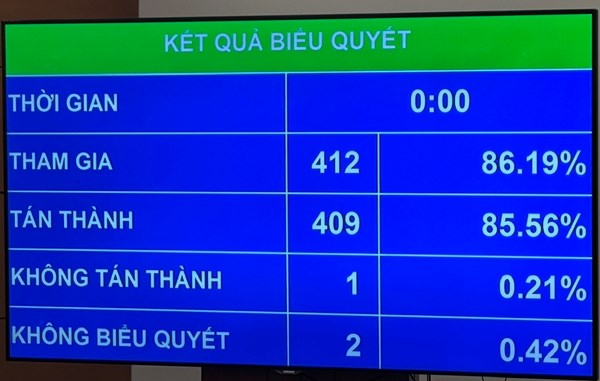 VOVVN - VOV.VN - Chiều 24/6, với 409/412 ý kiến tán thành (chiếm 85,56%), Quốc hội biểu quyết thông qua Luật sửa đổi, bổ sung một số điều của Luật Tổ chức Viện Kiểm sát nhân dân.