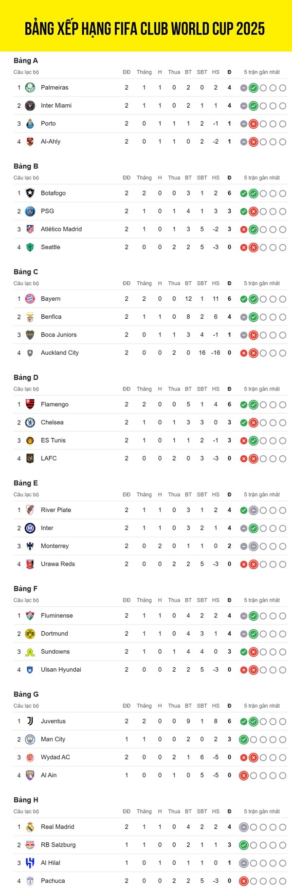 Bảng xếp hạng FIFA Club World Cup 2025 mới nhất: Real & Juventus áp sát vòng 1/8