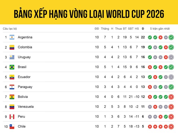 VOVVN - VOV.VN - Cập nhật bảng xếp hạng vòng loại World Cup 2026 khu vực Nam Mỹ trước lượt trận 11, Brazil đang tăng tốc và thu hẹp khoảng cách với đội dẫn đầu Argentina xuống...