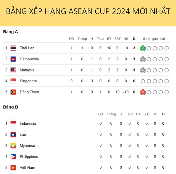 Bảng xếp hạng ASEAN Cup 2024 mới nhất: Thái Lan khẳng định sức mạnh
