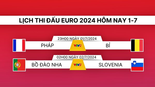 VOVVN - VOV.VN - Lịch thi đấu và trực tiếp EURO 2024 hôm nay 1/7 rạng sáng 2/7, Pháp so tài với Bỉ, trong khi Bồ Đào Nha đọ sức với Slovenia.