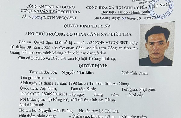 VOVVN - VOV.VN - Sáng ngày 12/11, Văn phòng Cơ quan CSĐT Công an tỉnh An Giang cho biết vừa bắt và di lý Nguyễn Văn Lâm (sinh năm 1998, cư trú xã Tri Tôn, tỉnh An...