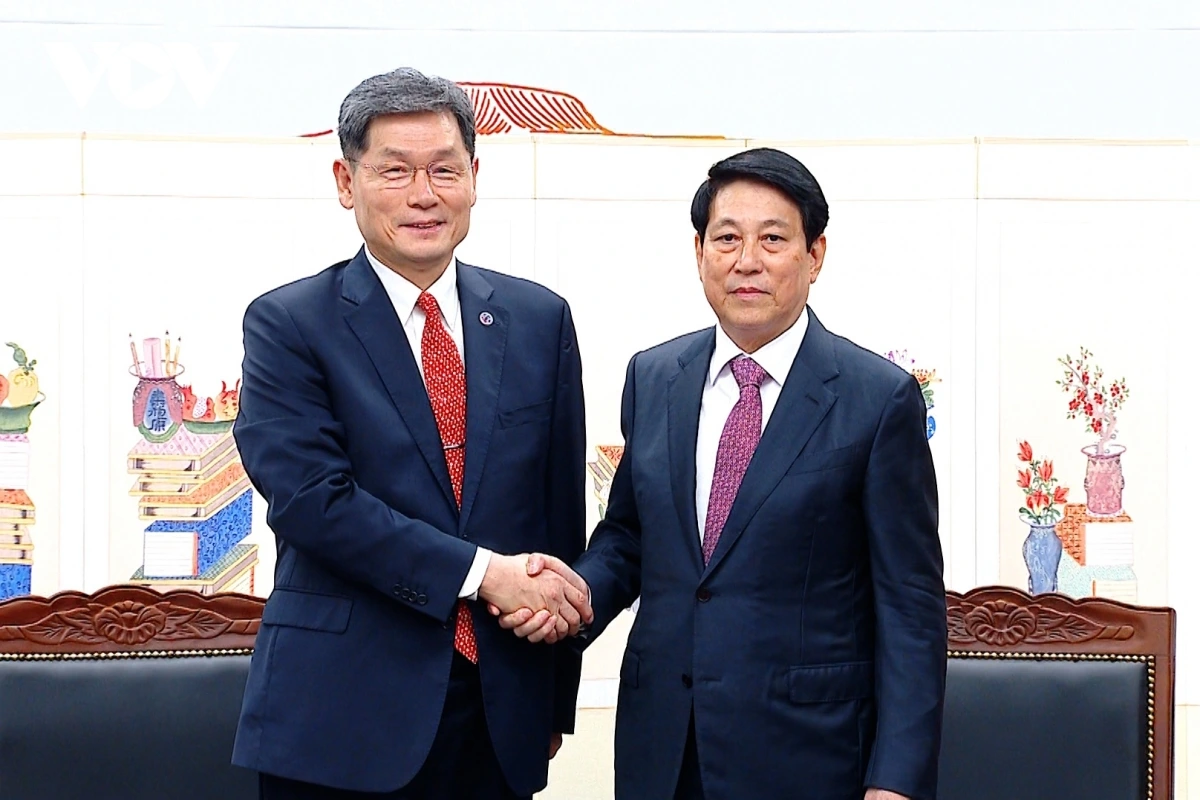 Sáng 30/10, Chủ tịch nước Lương Cường đã có các cuộc tiếp nhà sáng lập Tập đoàn MEBO International Lý Lợi, Tổng Thư ký Phòng Thương mại Quốc tế (ICC) John Denton, Chủ tịch Tập đoàn Lotte Shin Dong Bin. Trong ảnh: Chủ tịch nước Lương Cường tiếp Chủ tịch Tập đoàn Lotte Shin Dong Bin.