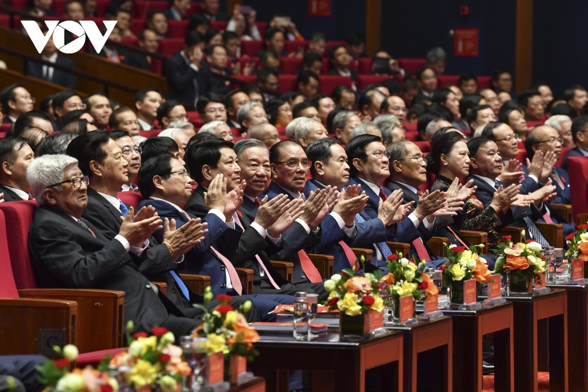 Các đại biểu chụp ảnh lưu niệm cùng Tổng Bí thư Tô Lâm, Chủ tịch nước Lương Cường, Thủ tướng Phạm Minh Chính, Chủ tịch Quốc hội Trần Thanh Mẫn và các lãnh đạo, nguyên lãnh đạo Đảng, Nhà nước.