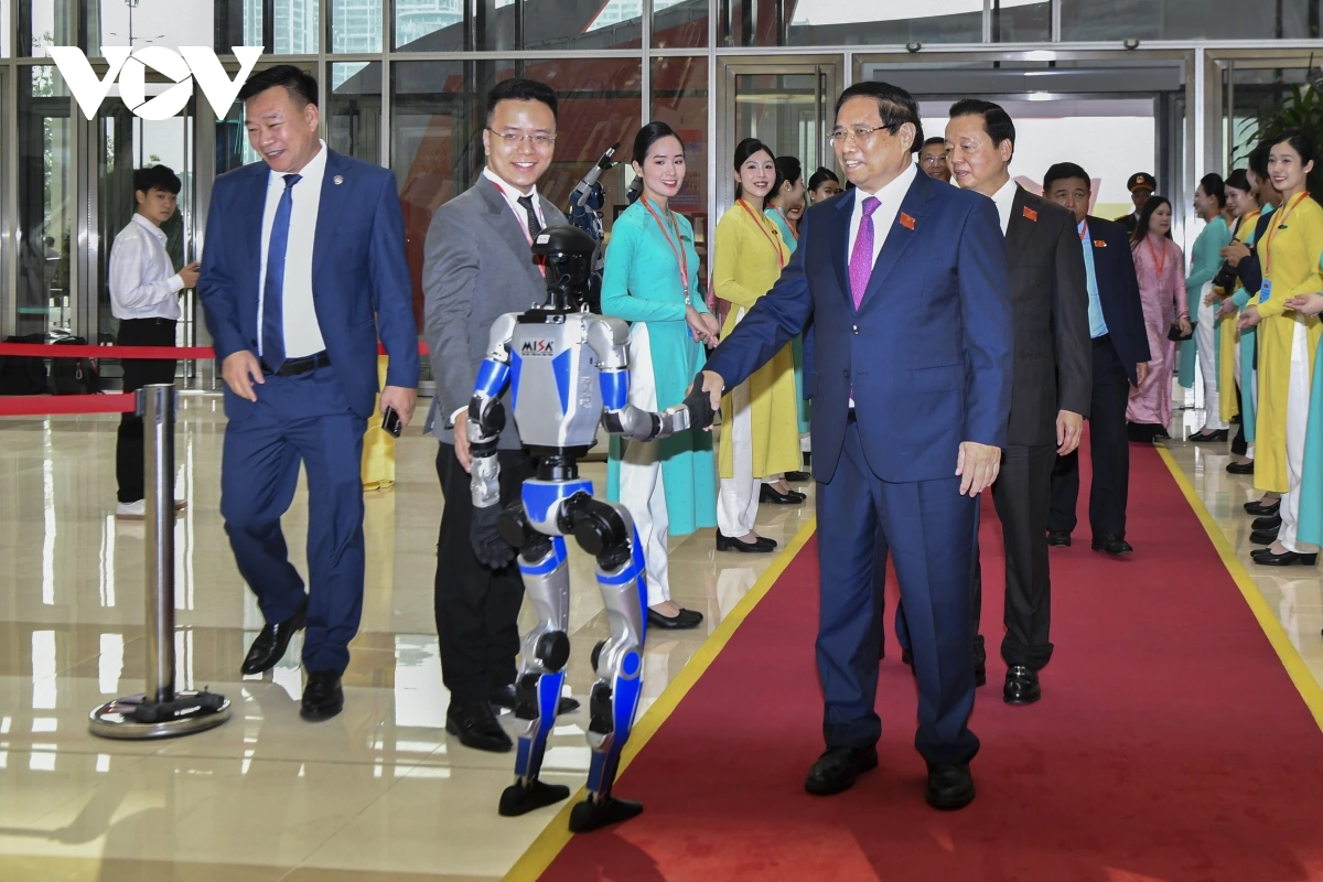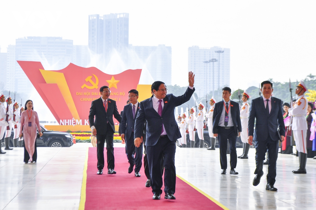 Thủ tướng Phạm Minh Chính và các đại biểu tới dự phiên trù bị Đại hội Đảng bộ Chính phủ tại Trung tâm Hội nghị quốc gia.