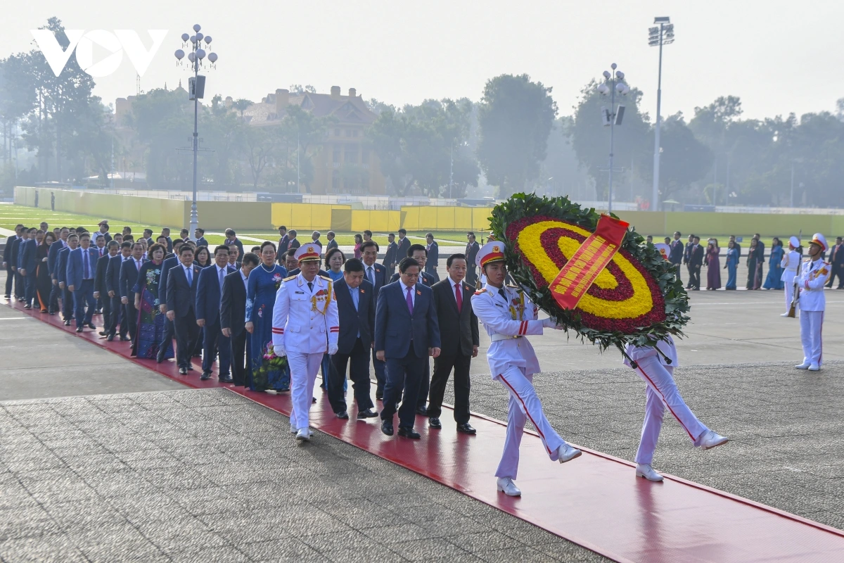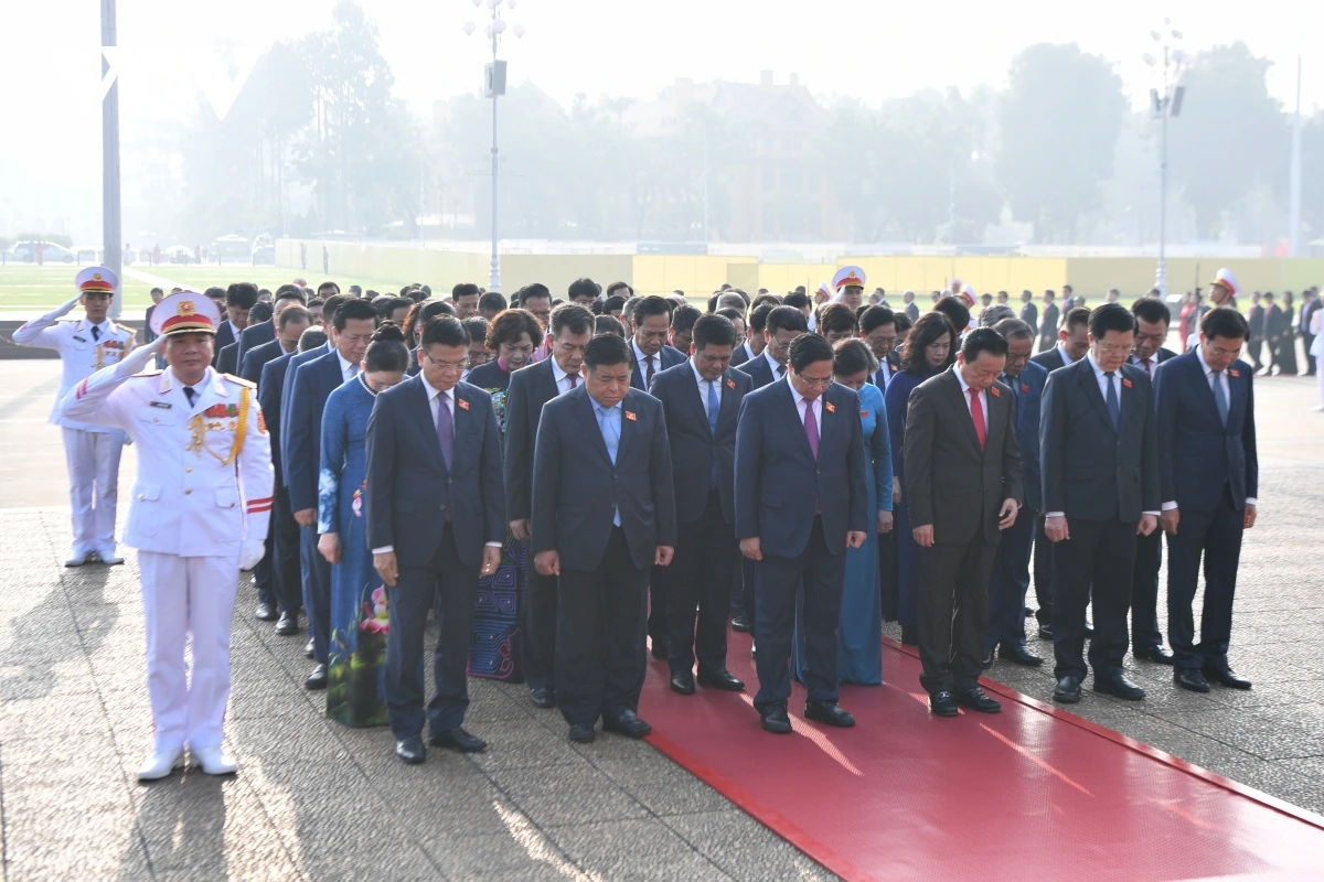 Trước khi tiến hành phiên trù bị tại Trung tâm Hội nghị Quốc gia, Thủ tướng Phạm Minh Chính và các đại biểu dự Đại hội Đảng bộ Chính phủ đã vào Lăng viếng Chủ tịch Hồ Chí Minh.