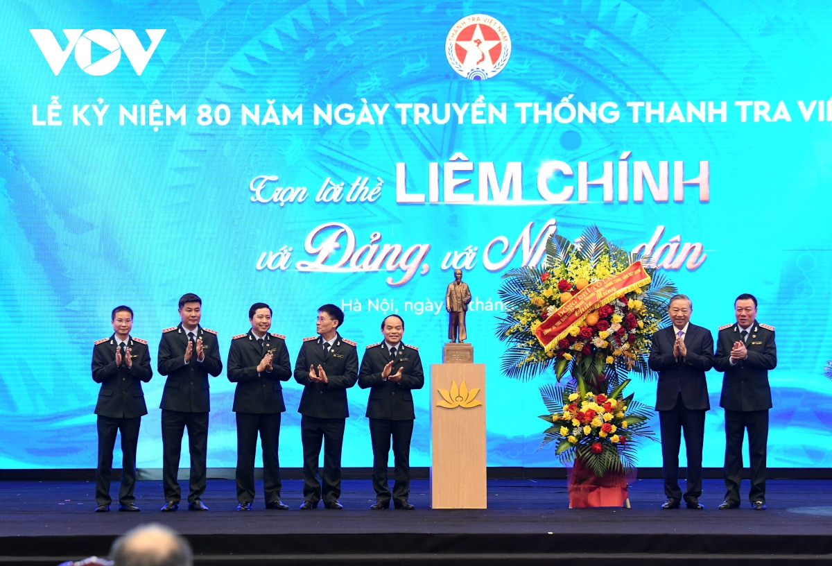 Phát biểu tại buổi lễ, Tổng Bí thư Tô Lâm khẳng định, ở đâu có công tác thanh tra, ở đó kỷ cương được thiết lập, niềm tin được củng cố, pháp luật được thượng tôn. Đó là niềm tự hào của 80 năm lịch sử – 80 năm khẳng định bản lĩnh, trí tuệ, sự tận trung, tận hiếu của đội ngũ cán bộ thanh tra đối với Đảng, Nhà nước và Nhân dân.