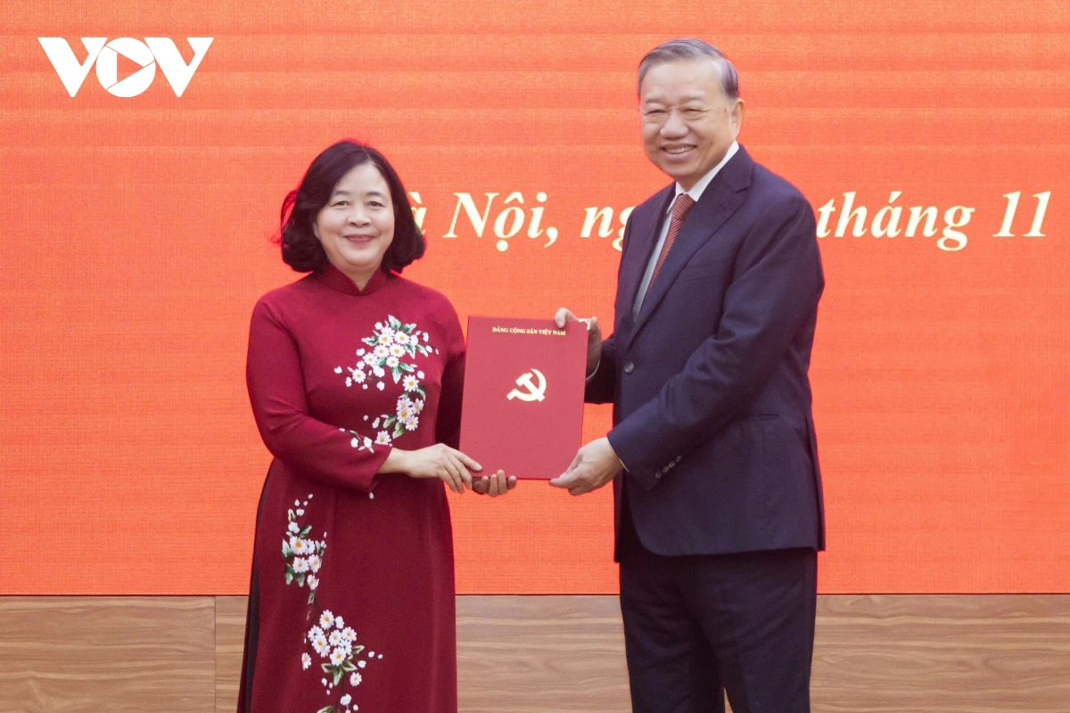 Tổng Bí thư Tô Lâm trao Quyết định của Bộ Chính trị điều động, phân công bà Bùi Thị Minh Hoài giữ chức Bí thư Đảng ủy Mặt trận Tổ quốc và các đoàn thể Trung ương.