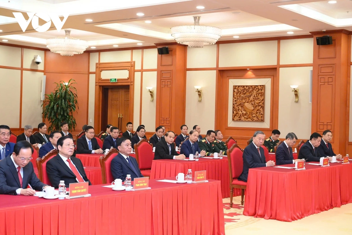 "Tôi đề nghị lãnh đạo và cán bộ, đảng viên trong Quân ủy Trung ương, Bộ Quốc phòng, Tổng cục Chính trị Quân đội nhân dân Việt Nam, Ban Tuyên giáo Dân vận Trung ương, Ban Nội chính Trung ương cùng với các cơ quan của Đảng tiếp tục ủng hộ, phối hợp, hỗ trợ các đồng chí lãnh đạo mới các cơ quan mình hoàn thành xuất sắc các nhiệm vụ như đã từng ủng hộ, giúp đỡ các đồng chí lãnh đạo trước đây, hiện nay của các cơ quan của mình. Trước mắt là tập trung tham mưu cho Trung ương các điều kiện để tổ chức thành công Đại hội Đảng toàn quốc lần thứ XIV", Tổng Bí thư Tô Lâm nói.