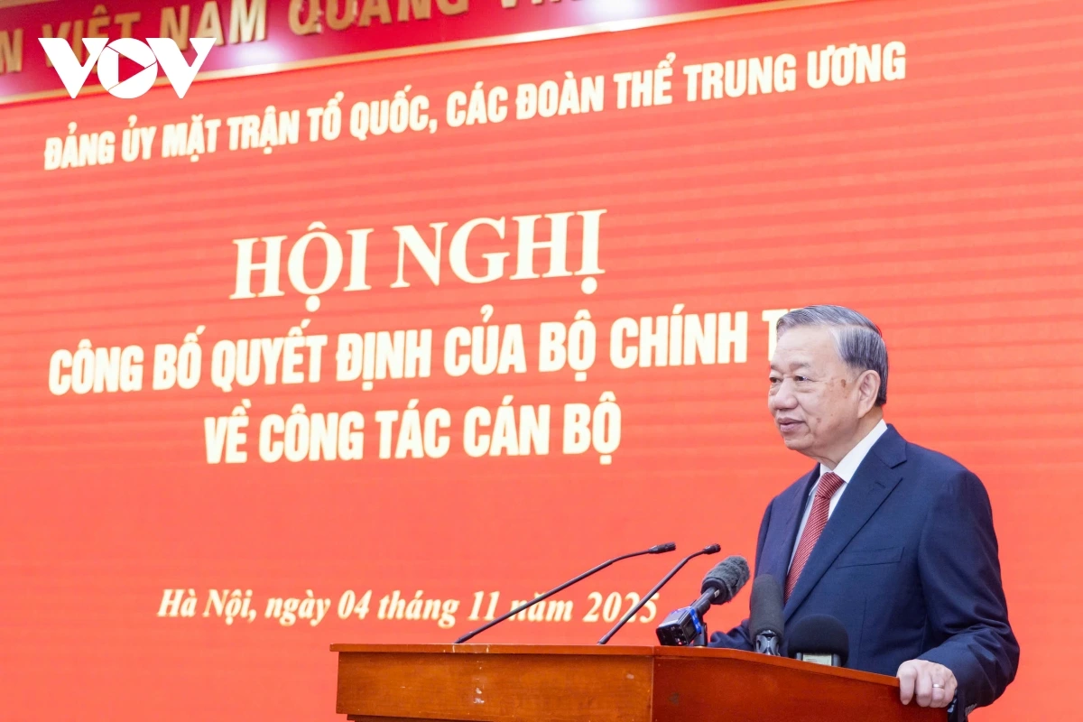 Sáng 4/11, tại Hà Nội, Ban Thường vụ Đảng ủy Mặt trận Tổ quốc (MTTQ) và các đoàn thể Trung ương tổ chức Hội nghị công bố quyết định về công tác cán bộ. Tổng Bí thư Tô Lâm dự Hội nghị, cùng dự có các Ủy viên Bộ Chính trị: Thường trực Ban Bí thư Trần Cẩm Tú; Trưởng ban Tổ chức Trung ương Lê Minh Hưng; Phó Bí thư Thường trực Đảng ủy Quốc hội Đỗ Văn Chiến và Bí thư Thành ủy Hà Nội, Trưởng Đoàn đại biểu Quốc hội khóa XV thành phố Hà Nội Bùi Thị Minh Hoài.