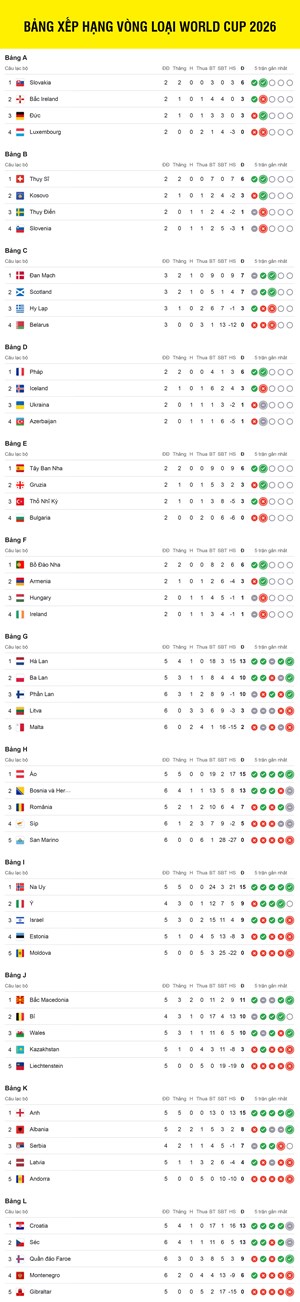 Bảng xếp hạng vòng loại World Cup 2026 khu vực châu Âu mới nhất