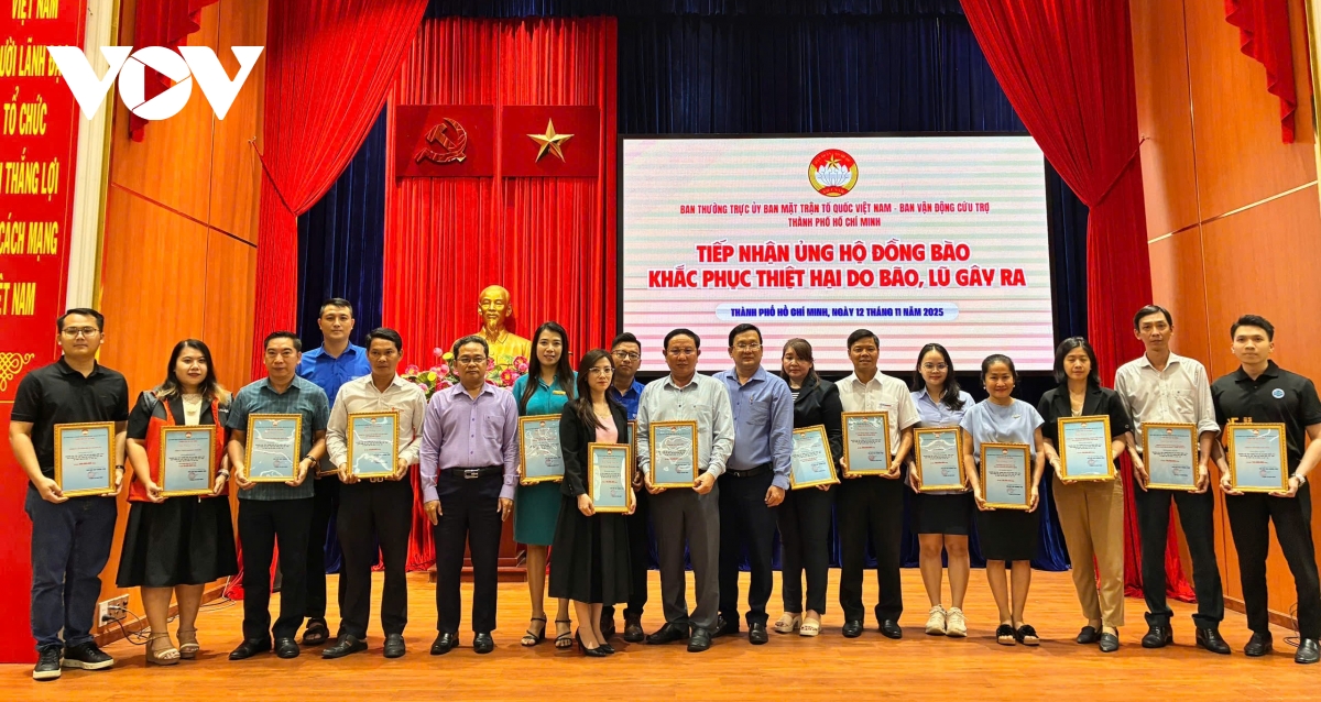 VOV.VN - Chiều 12/11, Ủy ban MTTQ Việt Nam TP.HCM – Ban Vận động cứu trợ Thành phố tiếp tục nhận được thêm nhiều đóng góp từ các đơn vị, doanh nghiệp ủng hộ đồng bào bị thiệt hại do bão, lũ.