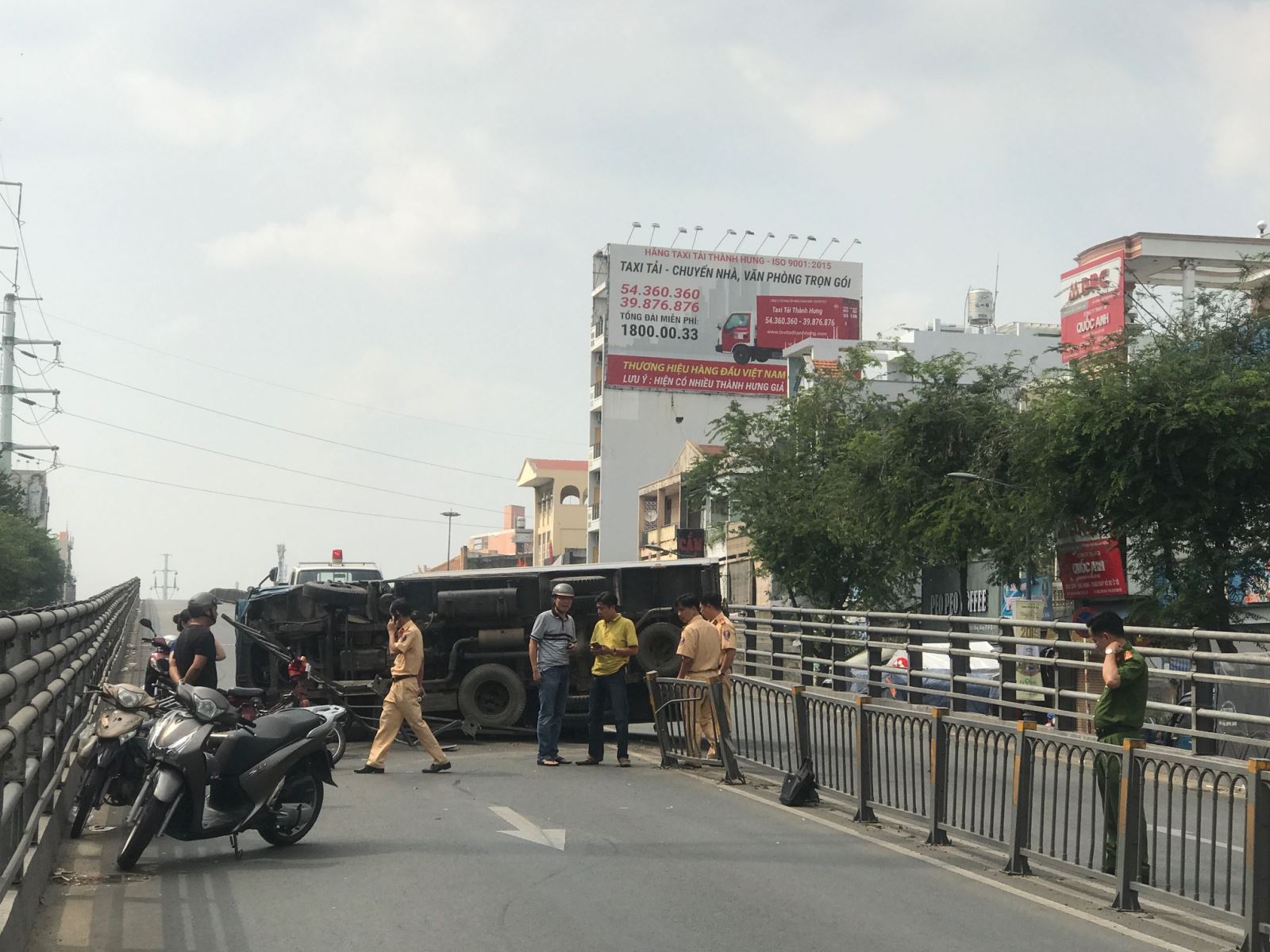 TP.HCM: Xe tải lật trên cầu vượt Cây Gõ, hai người đi xe máy thương nặng
