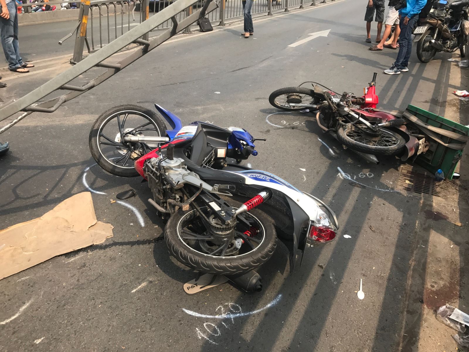 Ghi nhận tại hiện trường, hai chiếc xe máy lần lượt mang BKS 86B2-330.44 và 50M2-5865 hư hỏng nặng nằm rạp gần chiếc xe tải. Nhiều thanh chắn bằng thép ở giữa cầu cũng bị gãy đỗ.