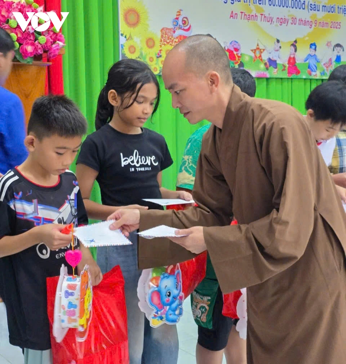 Trước đó, chùa Liên Hoa (xã Bình Ninh, tỉnh Đồng Tháp) cũng tổ chức tặng 100 suất học bổng và 100 phần quà Trung thu cho các em học sinh tại xã An Thạnh Thủy, mỗi suất trị giá 500 nghìn đồng.