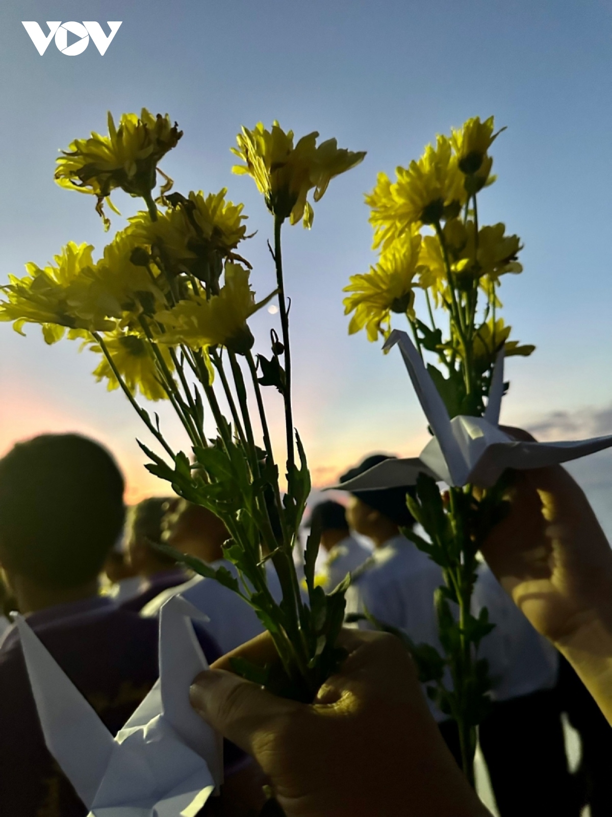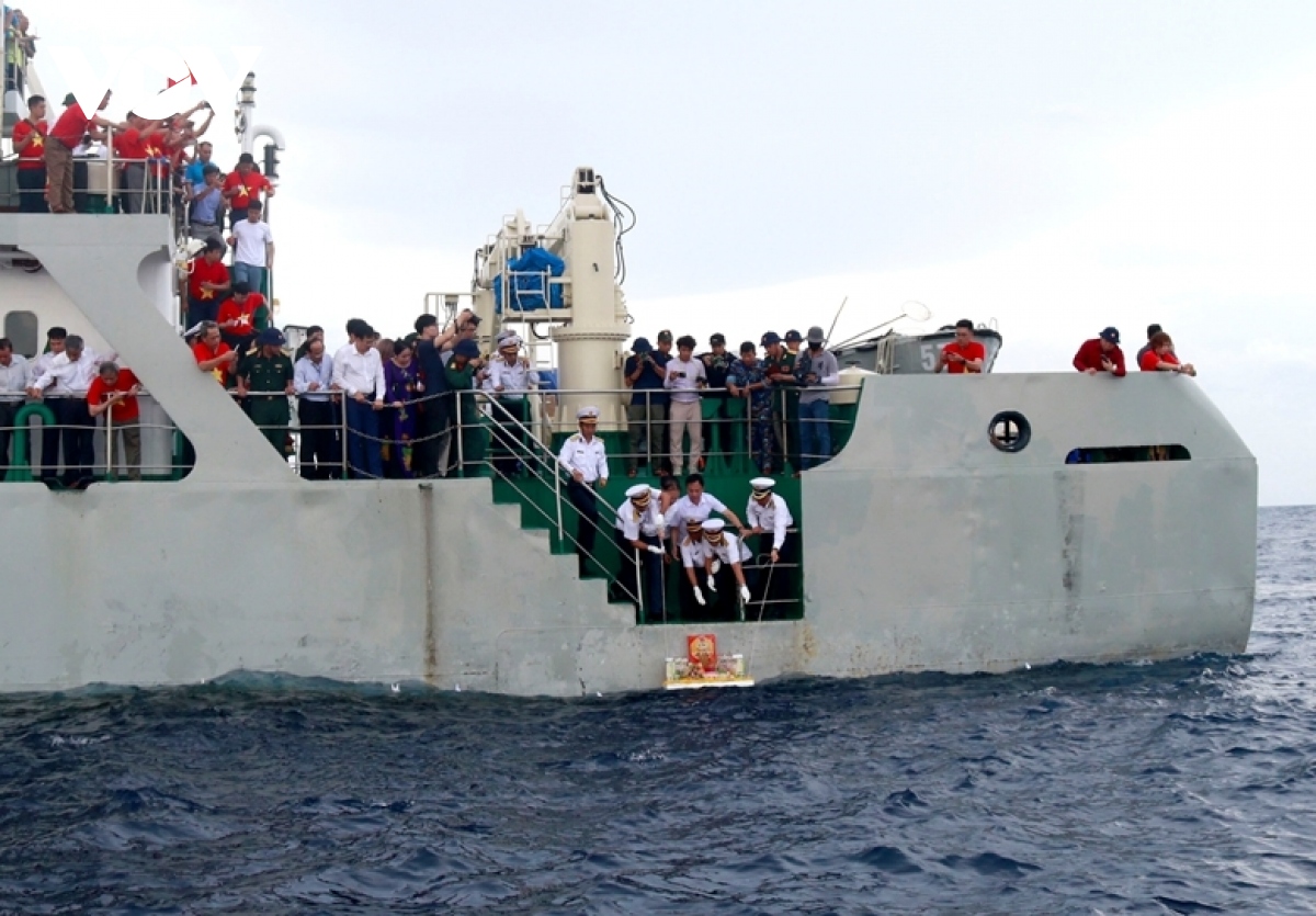 Trong không gian tĩnh lặng, giờ phút thiêng liêng, giữa trùng khơi, với lòng thành kính và niềm tiếc thương vô hạn, các đại biểu Đoàn công tác kính cẩn nghiêng mình ghi nhớ công ơn và tưởng nhớ các anh hùng liệt sĩ - những người con ưu tú của Hải quân nhân dân Việt Nam đã hiến trọn đời mình cho Tổ quốc.