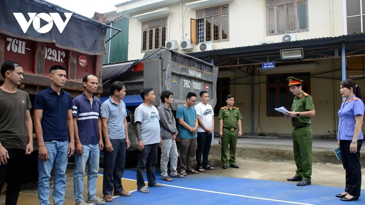 Cơ quan Cảnh sát điều tra Công an tỉnh Quảng Ngãi đã khởi tố 8 bị can, gồm: Võ Quận, Bùi Văn Được, Nguyễn Hồng Thương, Nguyễn Đợi, Ngô Thanh Quang, Võ Quang Hồng, Đỗ Văn Vũ, Nguyễn Quang Cự cùng trú phường Trường Quang Trọng, tỉnh Quảng Ngãi về tội “Vi phạm quy định về nghiên cứu, thăm dò, khai thác tài nguyên”, quy định tại Điều 227 Bộ luật hình sự. Cơ quan chức năng cũng khám xét nơi ở của 8 người này để thu thập các tài liệu liên quan.