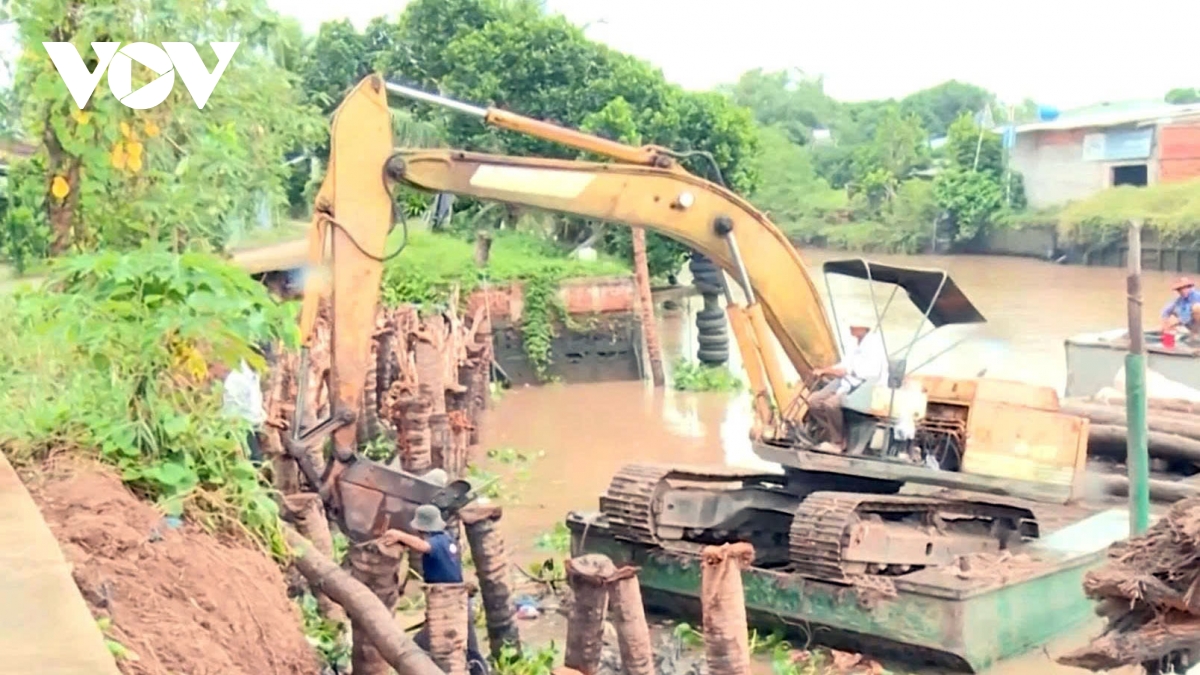 Triều cường gây sạt lở, uy hiếp bờ bao, giao thông và trường học tại Vĩnh Long