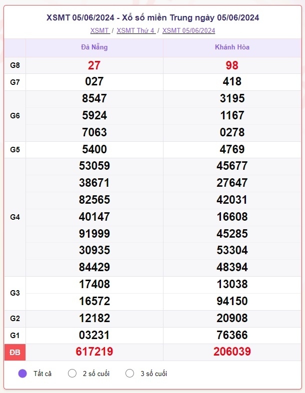 Kết quả xổ số miền Trung hôm nay thứ Bảy 8/6, phát trực tiếp từ trường quay xổ số Khánh Hòa - Đà Nẵng với mã hiệu XSKH, XSĐN. Kết quả XSMT ngày 8/6/2024 sẽ được quay thưởng từ lúc 18h15 - 18h35 phút, bắt đầu từ Giải Tám cho đến Giải Nhất, cuối cùng là công bố kết quả của Giải Đặc biệt. Trong tuần, hằng ngày chúng tôi sẽ cập nhật kết quả xổ số các vùng, miền, tỉnh thành khác trên cả nước.