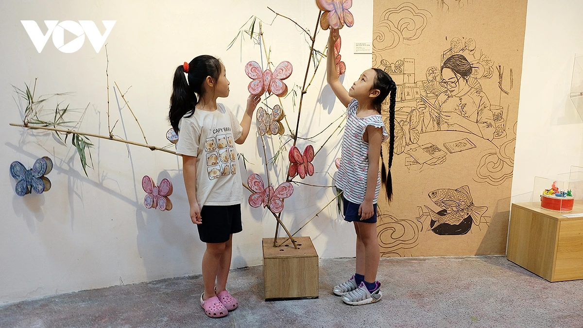 Các em nhỏ thích thú với đền con bướm làm bằng giấy dó tại khu trưng bày chủ đề “Sắc Thu” trong Chương trình “Tết Trung thu 2025 - Vui cùng trẻ thơ” tại Bảo tàng Dân tộc học Việt Nam.