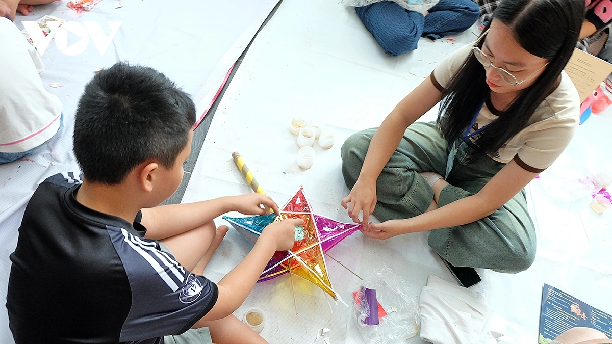 Hướng dẫn các em nhỏ làm đèn ông sao trong Chương trình “Tết Trung thu 2025 - Vui cùng trẻ thơ” tại Bảo tàng Dân tộc học Việt Nam.
