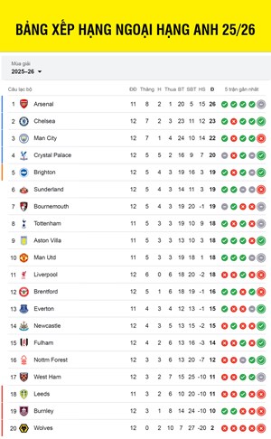 Bảng xếp hạng Ngoại hạng Anh 2025/2026 mới nhất