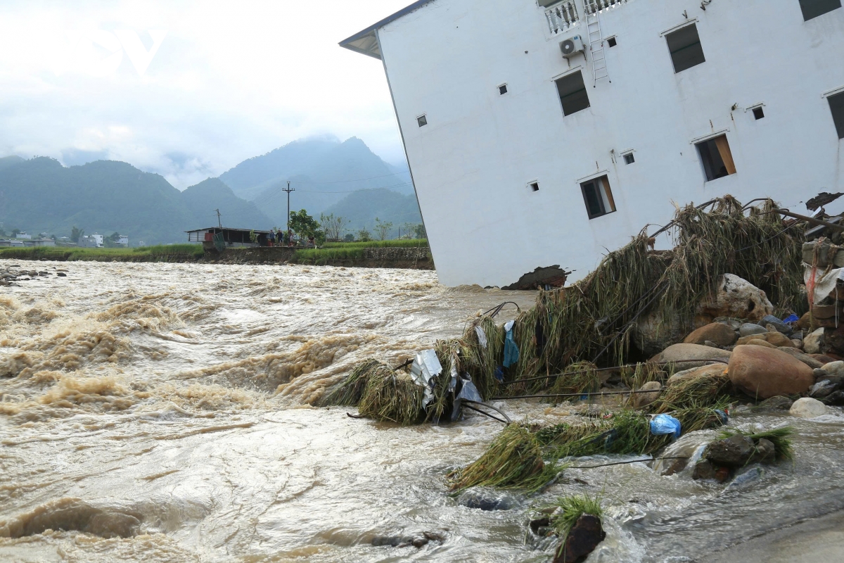 Chỉ trong ít phút ngắn ngủi, tầng một của ngôi nhà đã bị đánh sập, khiến toàn bộ cấu trúc đổ nghiêng xuống suối. Toàn bộ tài sản, hàng hóa kinh doanh, vật dụng sinh hoạt đều bị cuốn trôi hoặc vùi lấp.